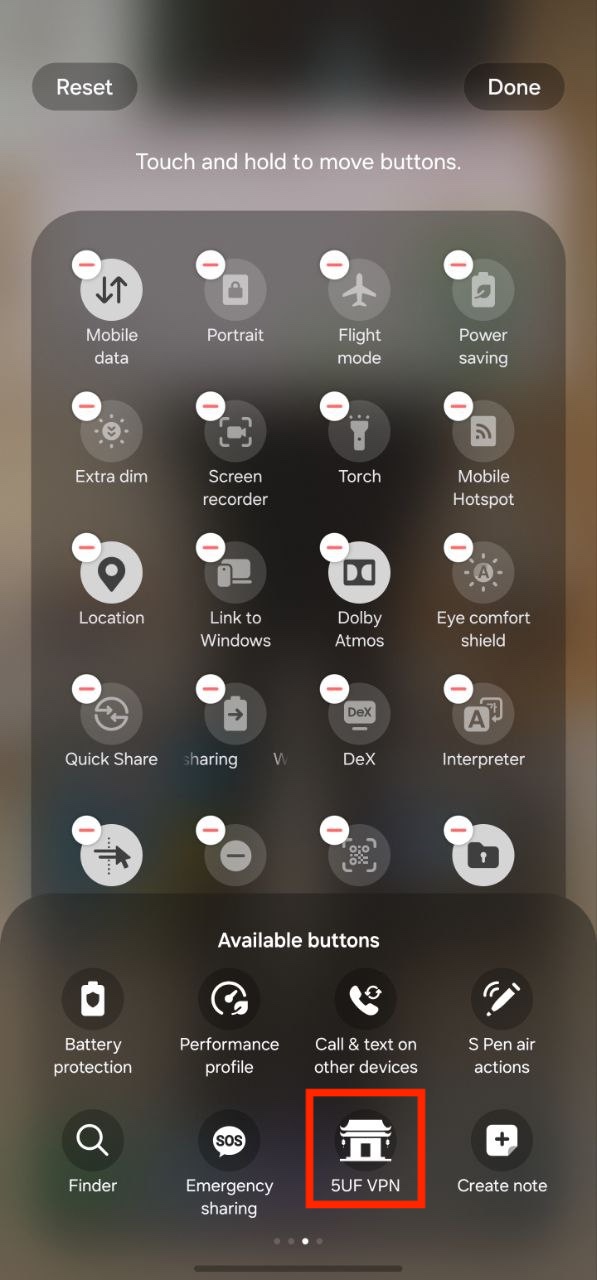 The following procedure outlines how to add the 5UF application to your device’s control panel, enabling immediate VPN activation directly from the system interface.