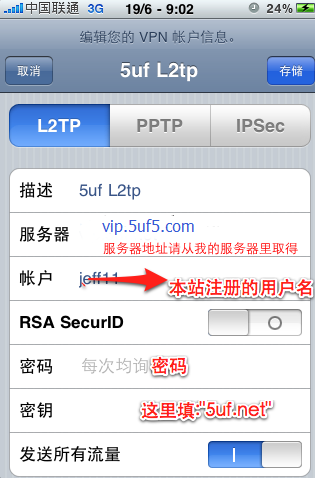 第五步:按照下面的示意图,在协议类型上选择“L2TP”,在“描述”栏中填入“5UF L2tp”,在服务器栏中填入“vip.5uf.cc”(服务器地址可以在"我的服务器"获得),在账户和密码栏中填入您在无忧府VPN上注册的用户名和密码,密钥为"5uf.net",其他设置保持不变,然后点击“存储”。