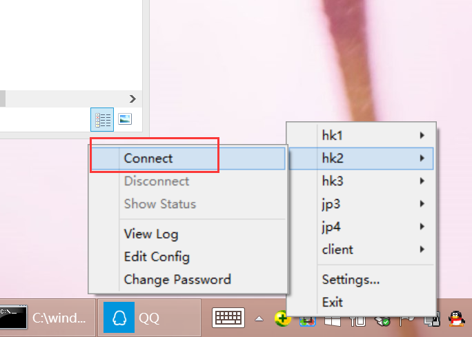 然后在右下角出现如下图的图标:选择所要连接的服务器,