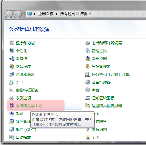 第一步:打开控制面板的”网络和共享中心“
